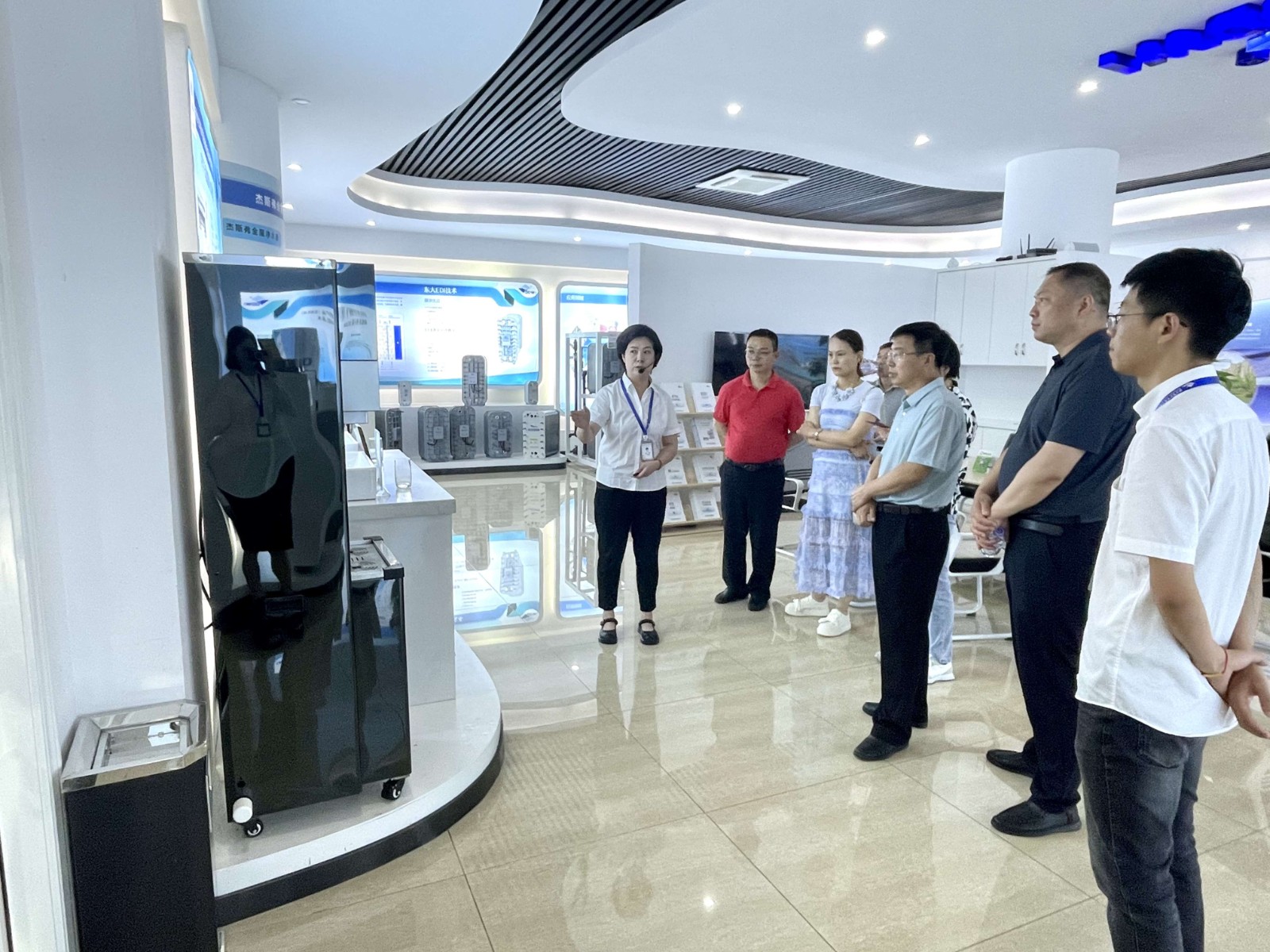 公司展厅,总经理钱建斌、副总经理金王勇为焦瑞河主席一行详细介绍了公司成立以来立足诸暨市为发展战略支点,进行绿色环保建设,推动各地区绿色低碳高质量发展中所做出的突出贡献和企业发展成果。